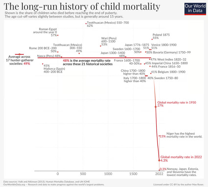 The most stark is child mortality. For most of human history, a newborn’s odds of surviving to puberty were a coin toss. Half of children died. If a family had six children, they might have to bury three of them. This was true across many time periods and locations: from Roman Egypt and Ancient Rome, to Imperial China and Medieval Japan.2 Data is more scarce for historical hunter-gatherer societies, so most of these estimates come from modern-day ones. The study did have evidence from one Palaeolithic society at the famous Indian Knoll archaeological site, dating back to around 2,500 BCE.3 In both modern and ancient hunter-gatherer societies, the rate was also close to 50%.