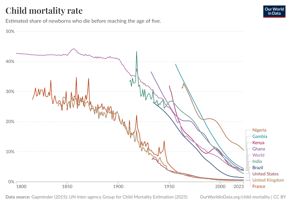 As I’ll come to, the world today is still tragically unequal. But it’s not true that this progress has only happened in some rich countries. Falling child mortality has happened everywhere. Take a look at the chart below [here’s the interactive data]. A baby born in Nigeria is more than 20-times more likely to die in childhood than one born in Britain. It is among the countries with the highest child mortality rates. Nonetheless, rates have fallen from over one-third to 10% within decades. In Gambia, rates have fallen dramatically from 40% to 5%. In post-colonial India, from 30% to 3%.