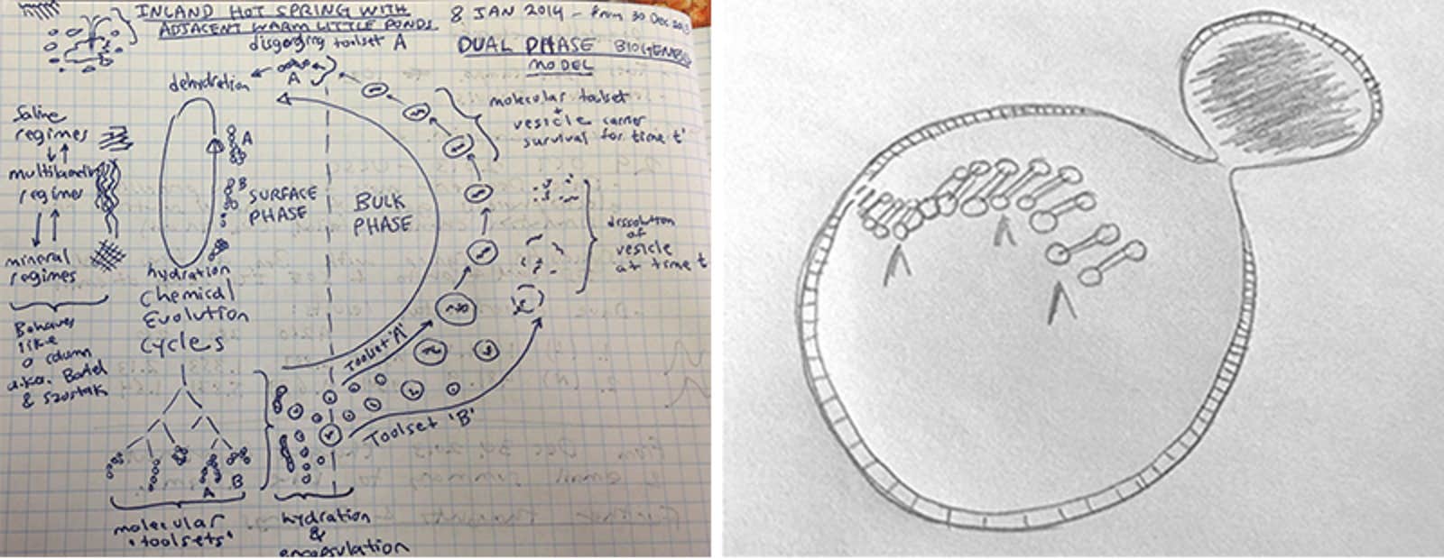 In 2015, Damer and Deamer co-published their first paper together in Life, an open-access journal. The paper describes how hot-spring pools dry and refill, concentrating organics, polymerizing them, and packaging them into protocells. Their hypothesis spurred a 2017 Scientific American cover story: “The New Origins of Life: Did volcanic hot springs harbor the first living organisms?”