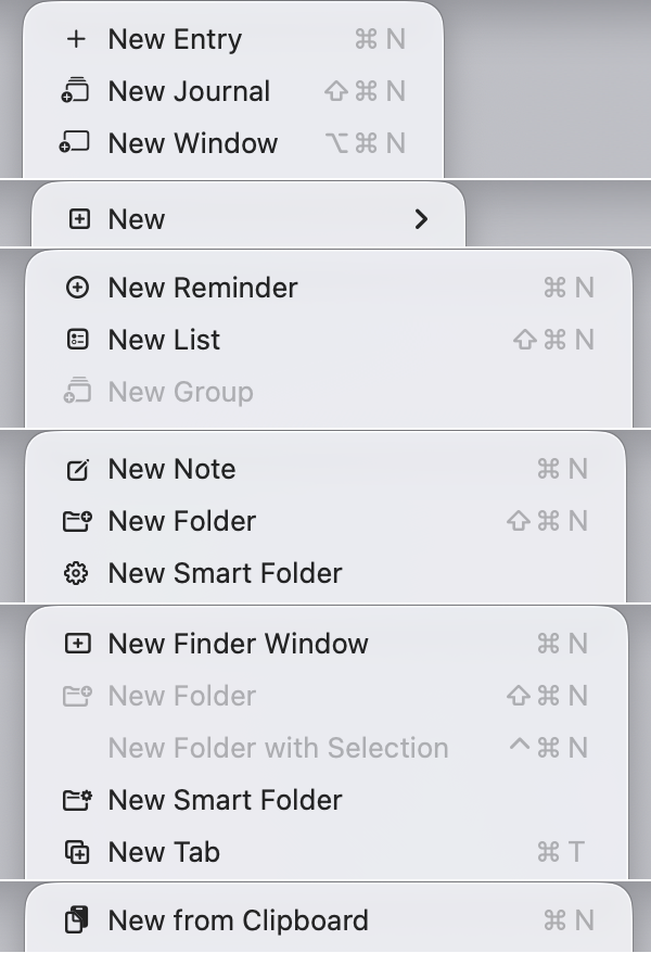 Granted, some of them are different operations, so they have different icons. I guess creating a smart folder is different from creating a journal entry. But this?